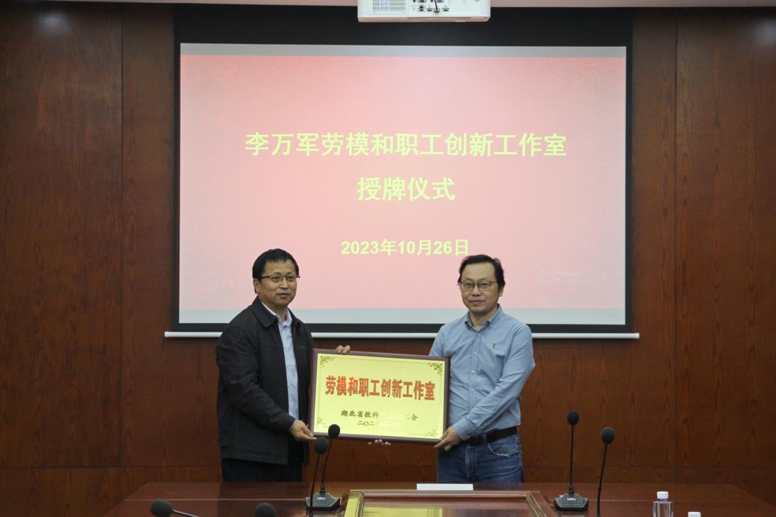 Li Xuechu, vice chairperson of the Education, Science, Culture, Health and Sports Trade Union of Hubei Province, presented a plaque to the Li Wanjun Model Worker and Staff Innovation Studio of our school.
