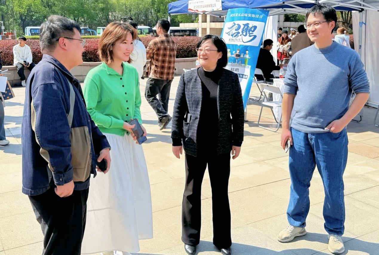 To thoroughly implement the decisions and plans of the Central Committee of the Communist Party of China and The State Council regarding the employment of college graduates and promote high-quality employment of art talents, on the afternoon of March 20th, the first art graduate job fair of the university, hosted by the Birmingham College, invited over 100 cultural and artistic industry enterprises to participate in the recruitment at the Jingwei Square of the Nanhu Campus of Wuhan Textile University. Xiang Rong, the Party Secretary of Birmingham College, Li Douming, the Deputy Secretary, and Zhang Xiaorui and Zhang Xinyi, the counselors of the 2021 graduating class, led the 2021 graduates to participate in this recruitment event.