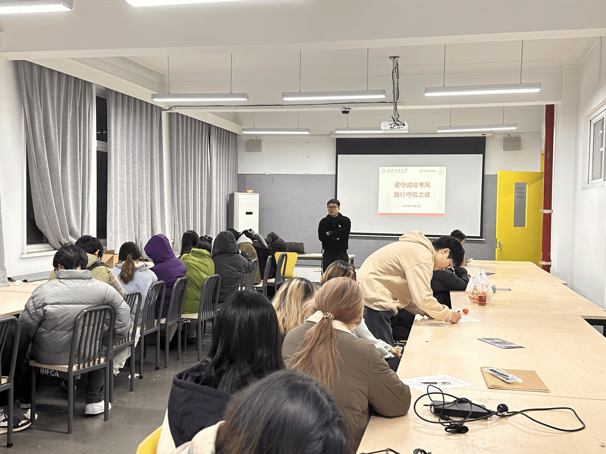岁末将至,为进一步强化学风建设、倡导诚信应考,伯明翰学院于12月7日下午组织召开“诺守诚信考风,践行守信之德”主题班会。班会围绕习近平总书记关于诚信建设的重要论述及学校相关考试纪律规定展开。学院党委副书记李斗明、全体辅导员、各班班主任及学生共同参加。