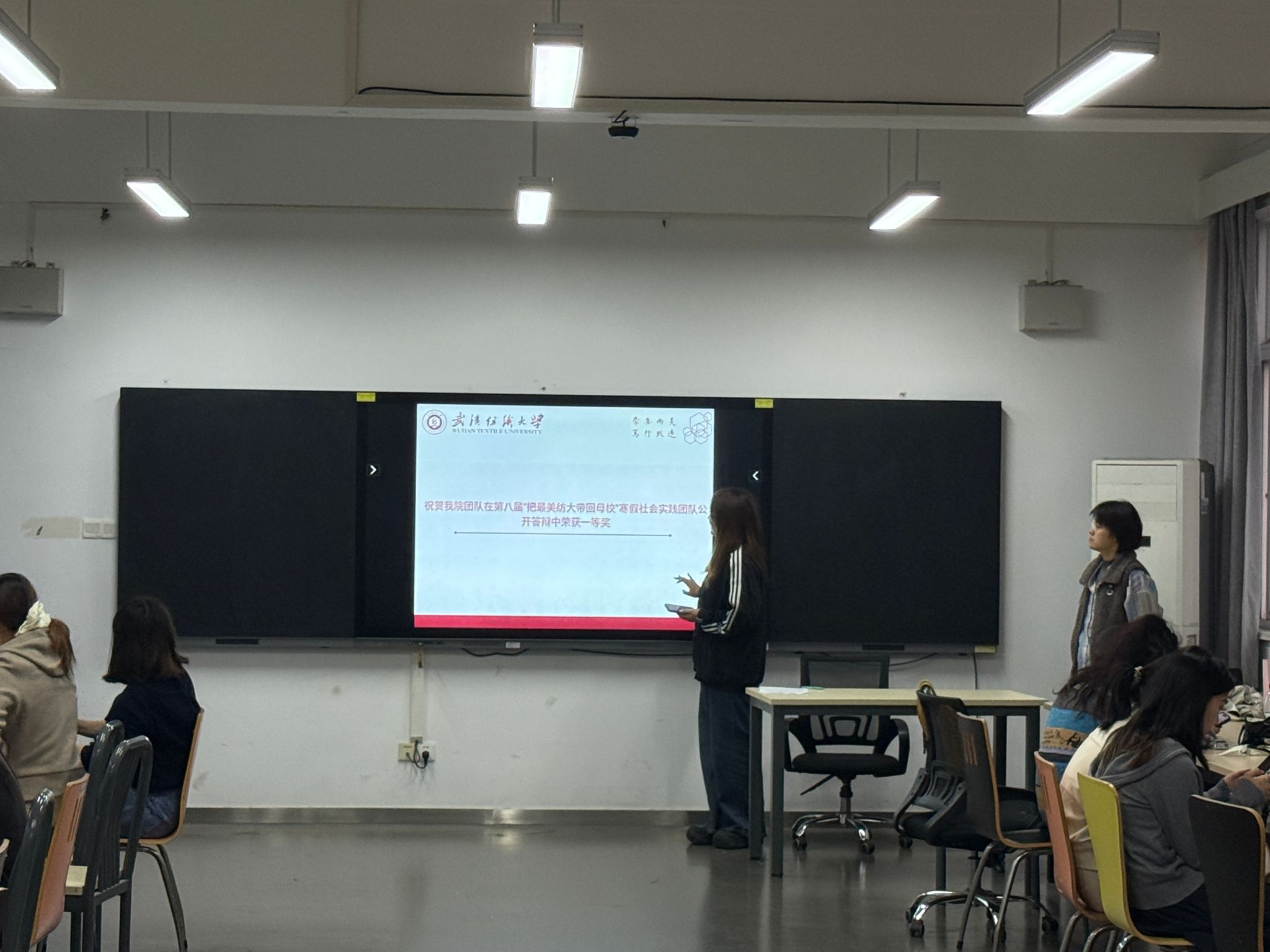 班会还就我院2025级育才美高团队在第八届“把最美纺大带回母校”寒假社会实践活动中荣获一等奖的好成绩进行了通报表扬,鼓励同学们积极参与社会实践,在实践中增长才干、展现风采。
