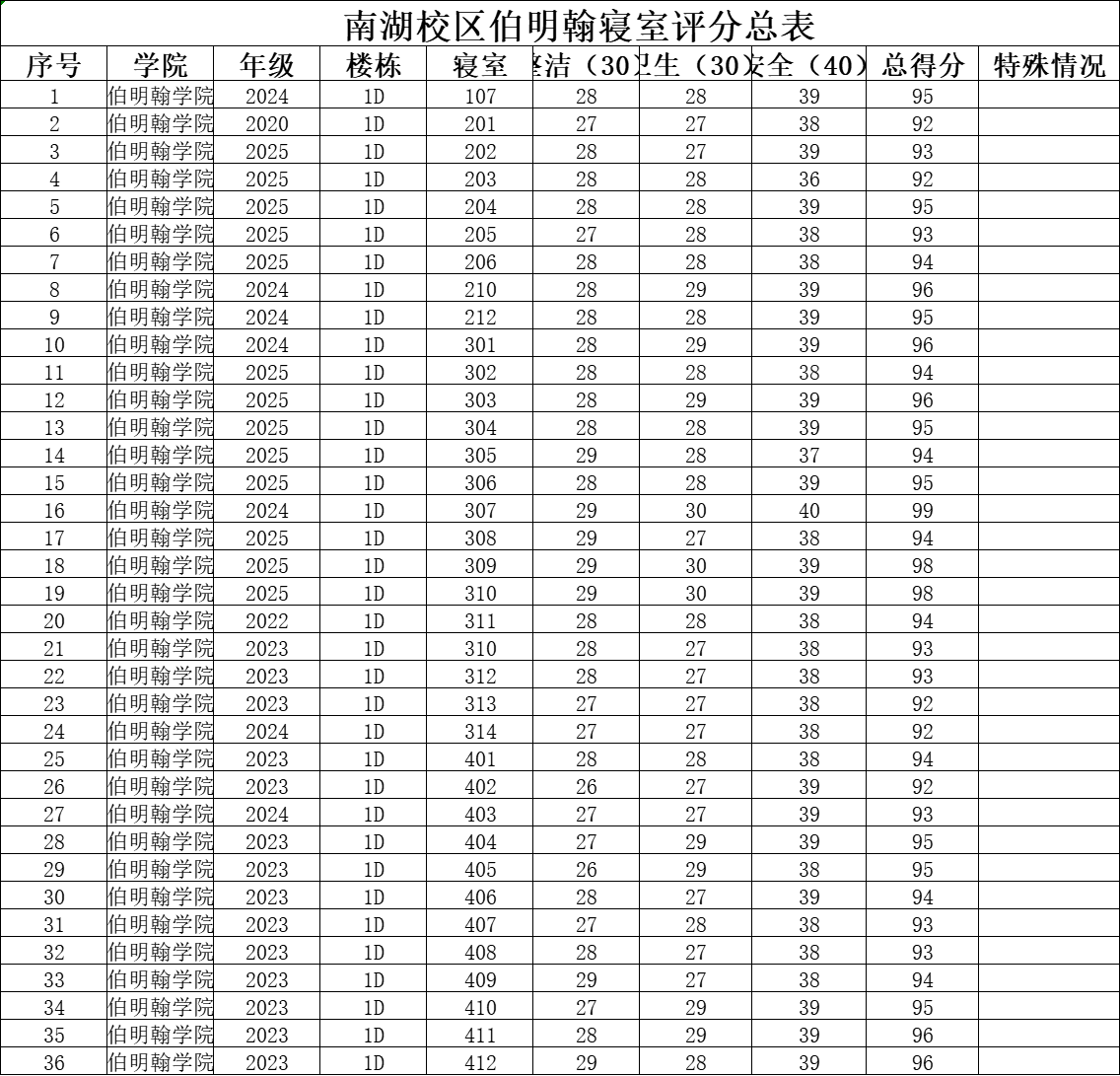 为加强宿舍管理,确保宿舍环境整洁、安全、有序,特制定本周检公示表。通过定期检查和公示,旨在提高同学们的卫生意识和安全意识,共同营造一个良好的学习和生活环境。