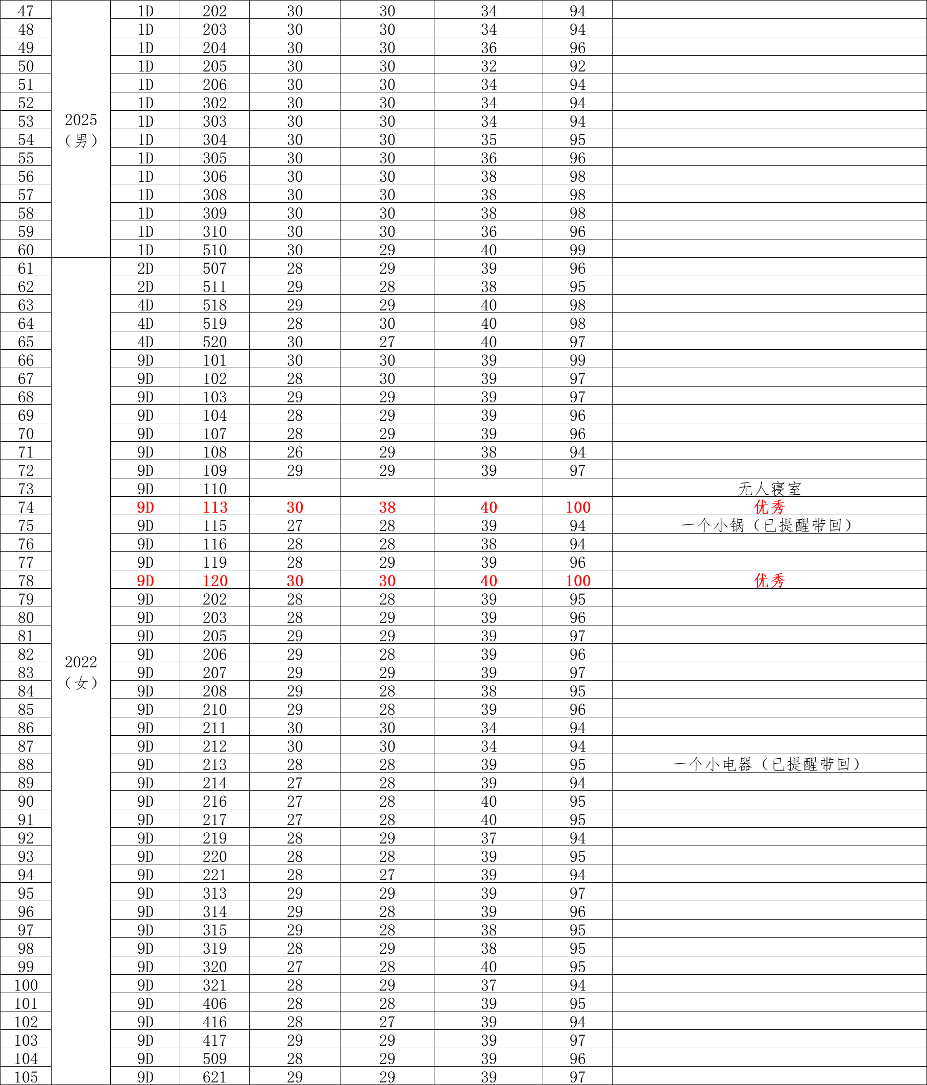 为加强宿舍管理,确保宿舍环境整洁、安全、有序,特制定本周检公示表。通过定期检查和公示,旨在提高同学们的卫生意识和安全意识,共同营造一个良好的学习和生活环境。