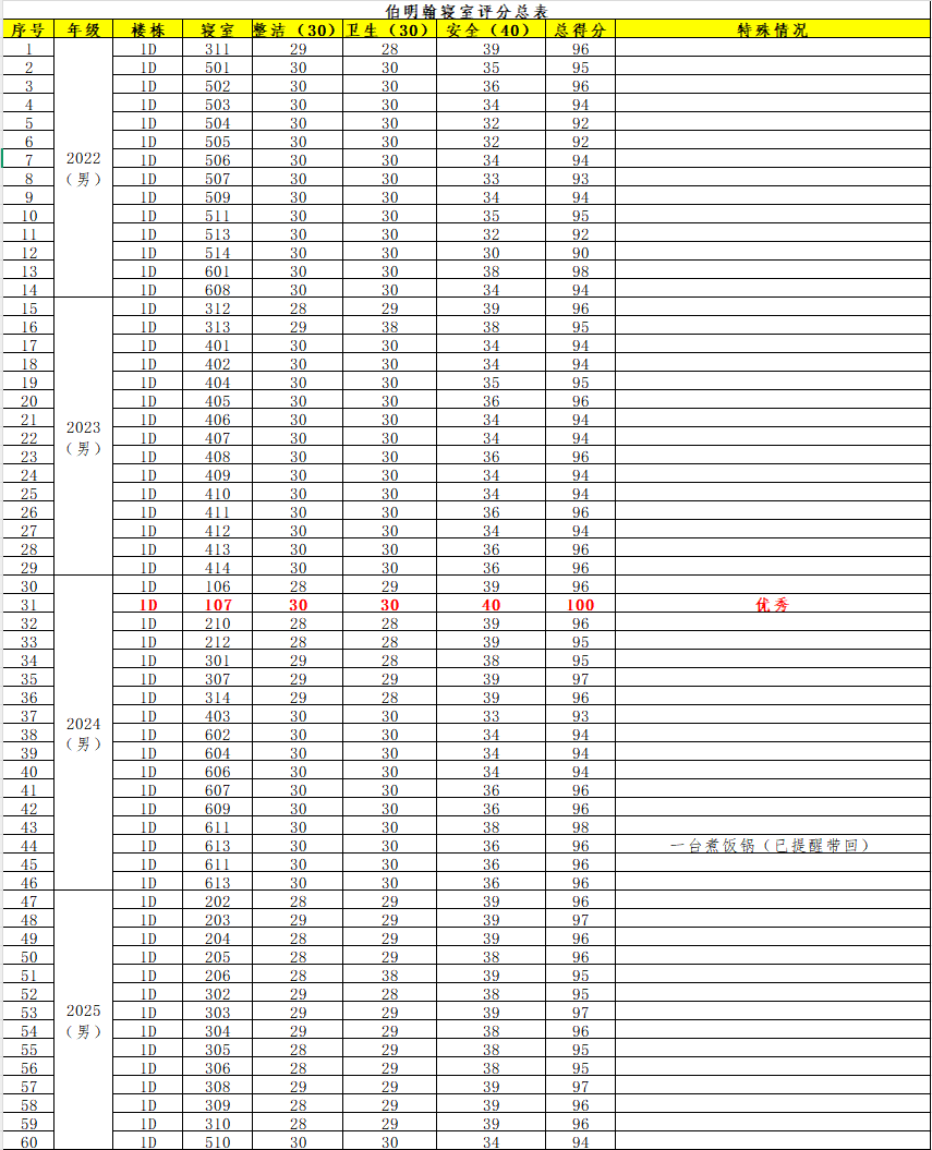 为加强宿舍管理,确保宿舍环境整洁、安全、有序,特制定本周检公示表。通过定期检查和公示,旨在提高同学们的卫生意识和安全意识,共同营造一个良好的学习和生活环境。