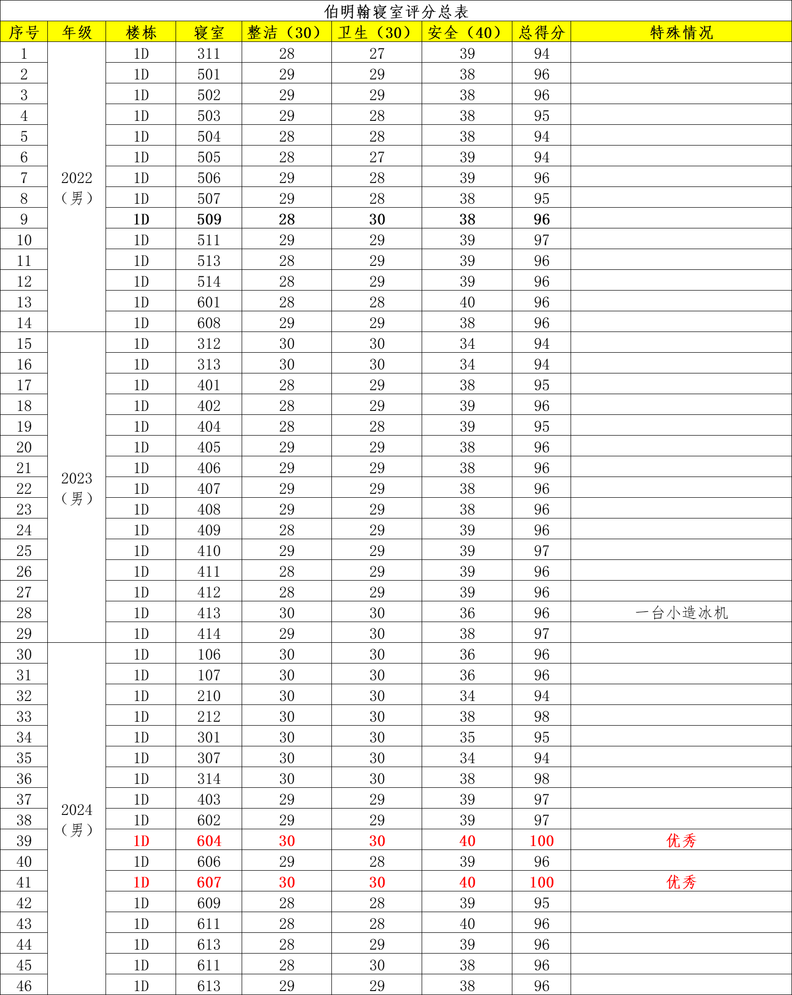 本周标杆宿舍:1栋204,1栋304,1栋305,1栋604,1栋607,2栋106,2栋308,2栋311,2栋613,2栋614,4栋213,4栋217,8栋201,8栋223,9栋220