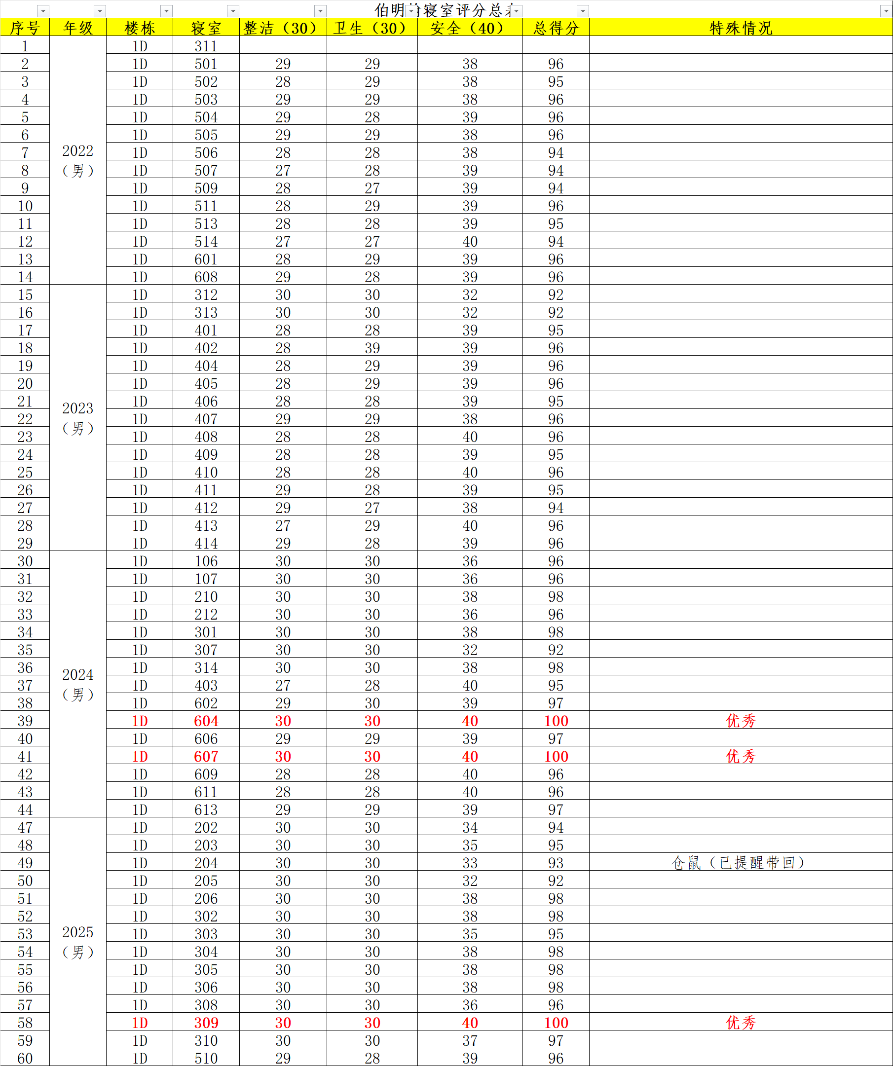 本周标杆宿舍:1栋604,1栋607,1栋309,4栋221,4栋201,9栋503,8栋120,2栋303,8栋526