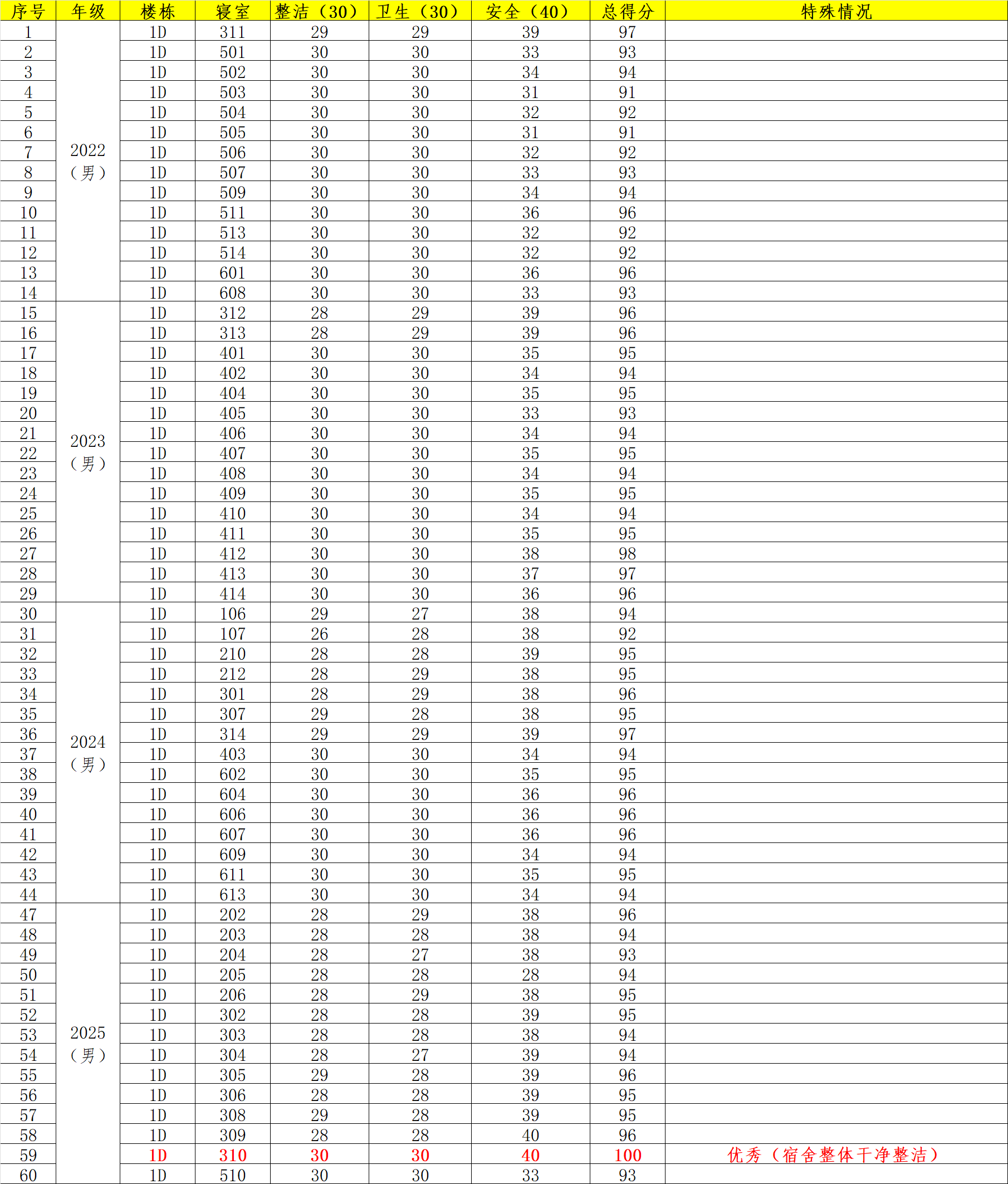 为加强宿舍管理,确保宿舍环境整洁、安全、有序,特制定本周检公示表。通过定期检查和公示,旨在提高同学们的卫生意识和安全意识,共同营造一个良好的学习和生活环境。