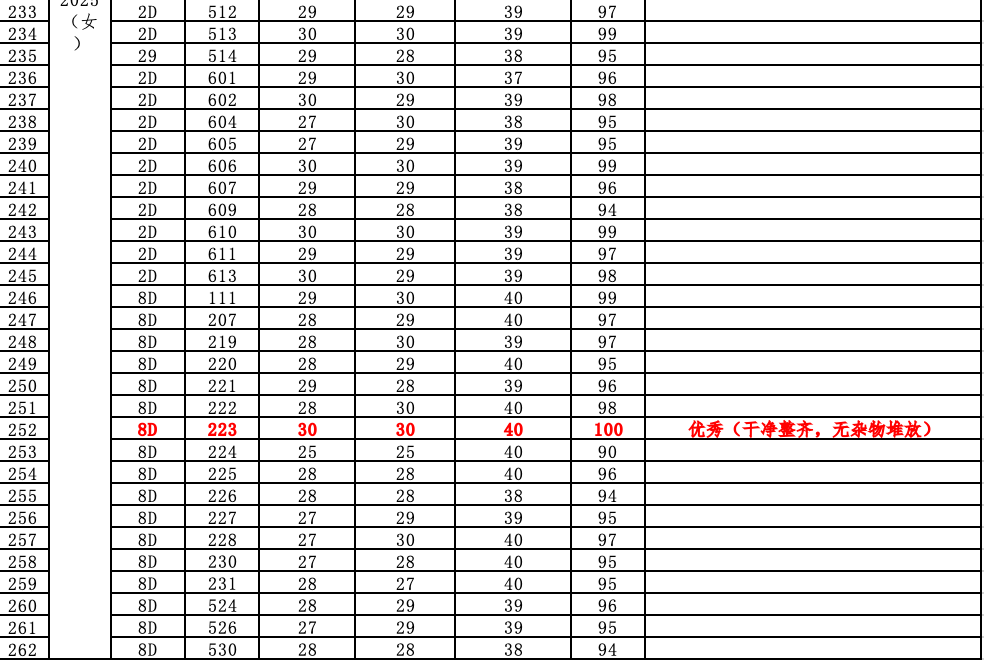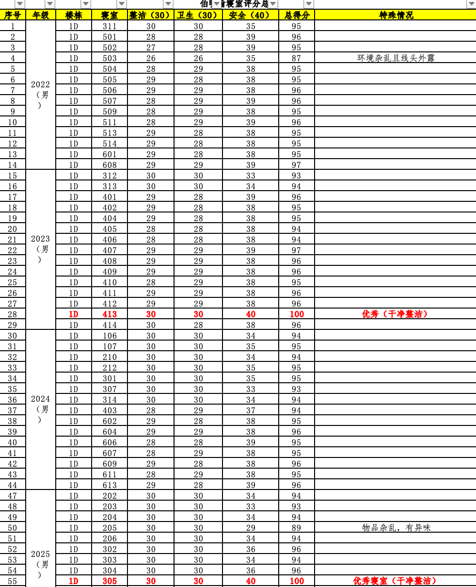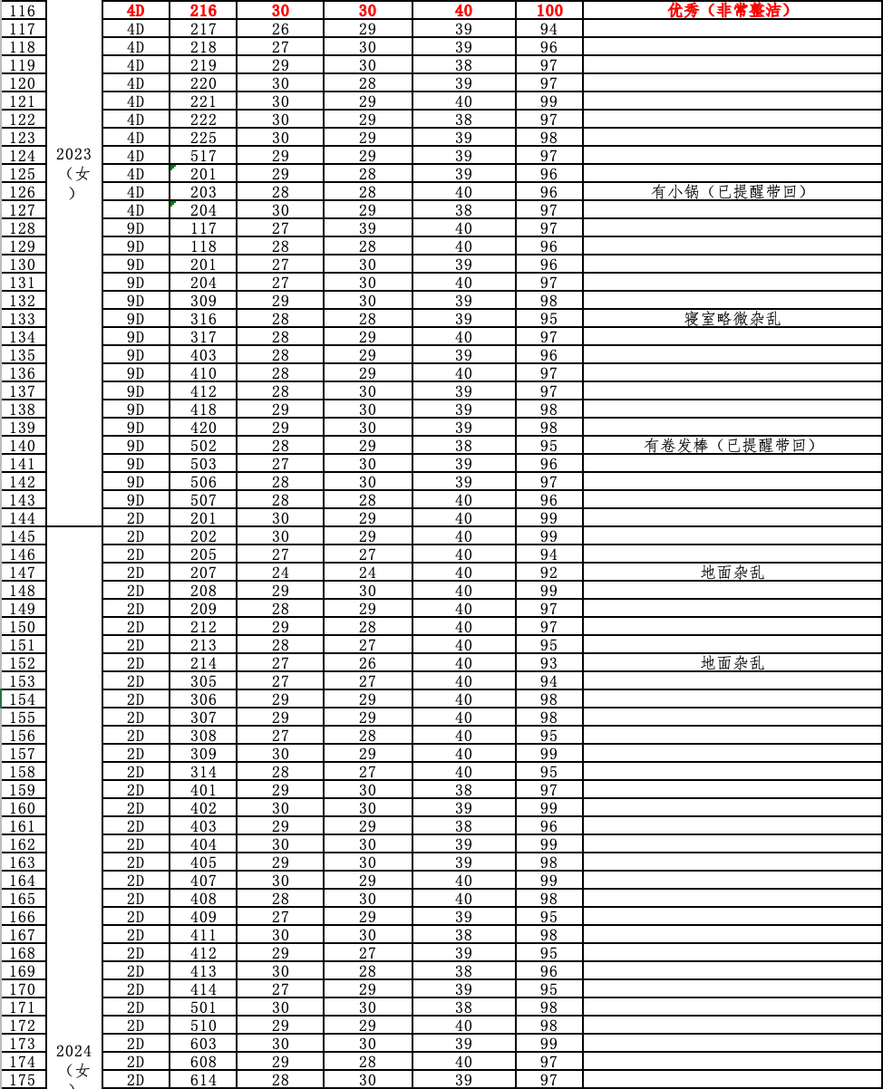 为加强宿舍管理,确保宿舍环境整洁、安全、有序,特制定本周检公示表。通过定期检查和公示,旨在提高同学们的卫生意识和安全意识,共同营造一个良好的学习和生活环境。